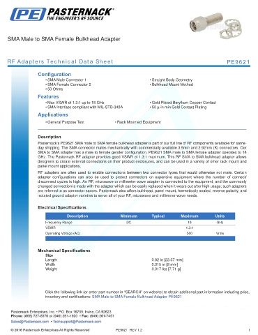 inventory and certifications: SMA Male to SMA Female Bulkhead Adapter PE9621