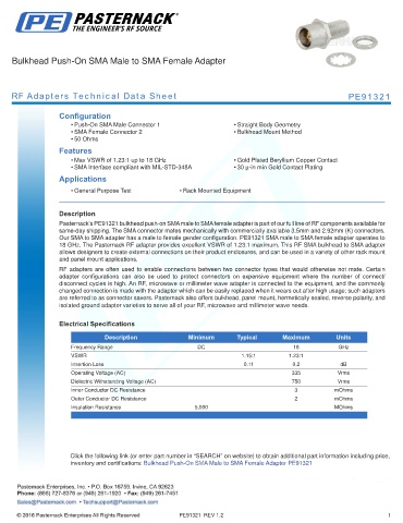 Pasternack’s PE91321 bulkhead push-on SMA male to SMA female adapter is part of our full line of RF components available for