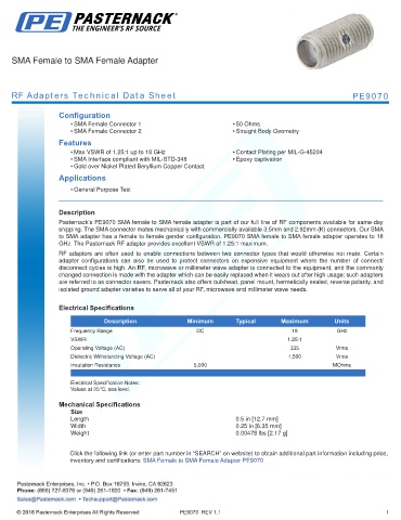 inventory and certifications: SMA Female to SMA Female Adapter PE9070