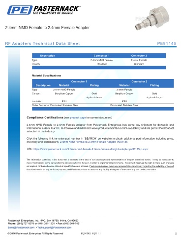 inventory and certifications: 2.4mm NMD Female to 2.4mm Female Adapter PE91145