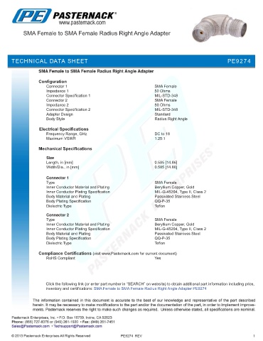 inventory and certifications: SMA Female to SMA Female Radius Right Angle Adapter PE9274