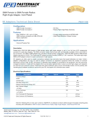 adapter operates to 18 GHz. The Pasternack RF adapter provides excellent VSWR of 1.25:1 maximum. This radius right angle