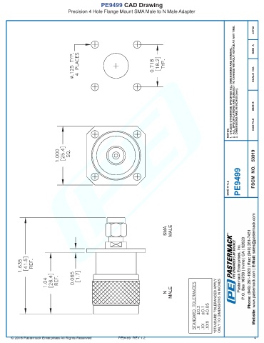 PE9499 CAD Drawing Precision 4 Hole Flange Mount SMA Male to N Male Adapter PE9499 REV 1.2 4