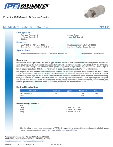 Pasternack’s PE9433 precision SMA male to type N female adapter is part of our full line of RF components available for