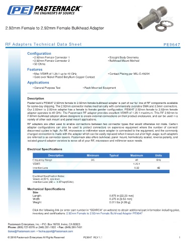 inventory and certifications: 2.92mm Female to 2.92mm Female Bulkhead Adapter PE9647