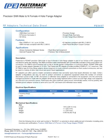 Pasternack’s PE9497 precision SMA male to type N female 4 hole flange adapter is part of our full line of RF components