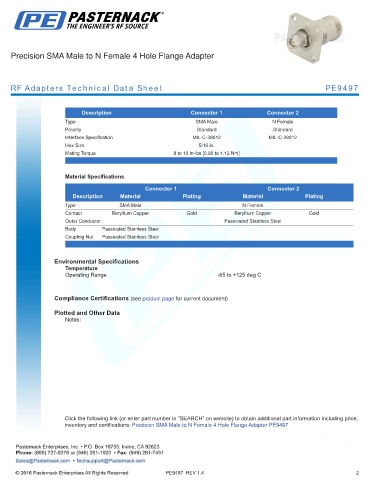 inventory and certifications: Precision SMA Male to N Female 4 Hole Flange Adapter PE9497