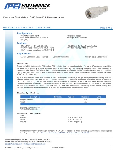 design. PE91063 SMA male to SMP male adapter operates to 26.5 GHz. The Pasternack RF adapter provides excellent