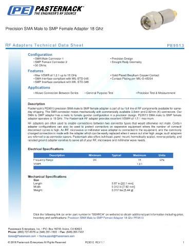 Pasternack’s PE9513 precision SMA male to SMP female adapter is part of our full line of RF components available for same-