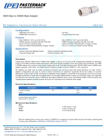 inventory and certifications: SMA Male to SSMA Male Adapter PE9187