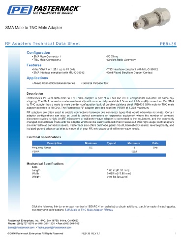 inventory and certifications: SMA Male to TNC Male Adapter PE9439
