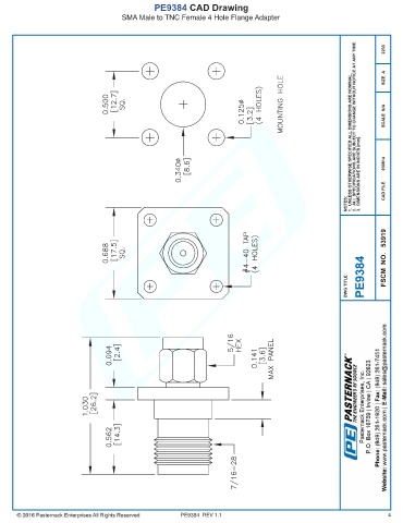 PE9384 CAD Drawing SMA Male to TNC Female 4 Hole Flange Adapter PE9384 REV 1.1 4
