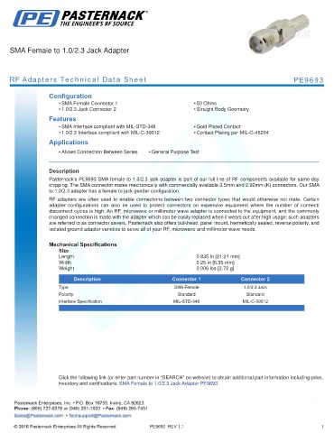 inventory and certifications: SMA Female to 1.0/2.3 Jack Adapter PE9693