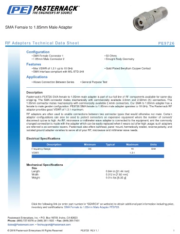 female to male gender configuration. PE9726 SMA female to 1.85mm male adapter operates to 18 GHz. The Pasternack RF