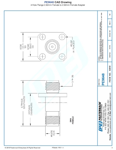PE9648 CAD Drawing 4 Hole Flange 2.92mm Female to 2.92mm Female Adapter PE9648 REV 1.1 4