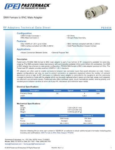 inventory and certifications: SMA Female to BNC Male Adapter PE9494