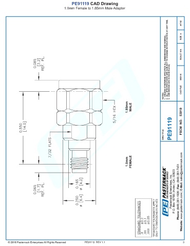PE91119 CAD Drawing 1.0mm Female to 1.85mm Male Adapter PE91119 REV 1.1 3