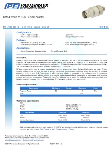 inventory and certifications: SMA Female to BNC Female Adapter PE9496