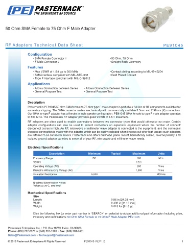inventory and certifications: 50 Ohm SMA Female to 75 Ohm F Male Adapter PE91045
