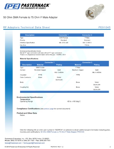 inventory and certifications: 50 Ohm SMA Female to 75 Ohm F Male Adapter PE91045