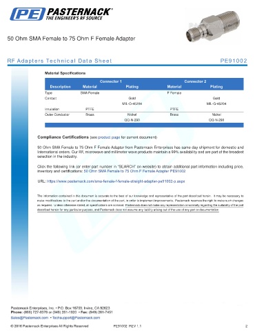 inventory and certifications: 50 Ohm SMA Female to 75 Ohm F Female Adapter PE91002