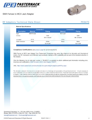 inventory and certifications: SMA Female to MCX Jack Adapter PE9470