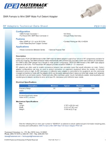 inventory and certifications: SMA Female to Mini SMP Male Full Detent Adapter PE91129