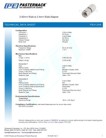 inventory and certifications: 2.92mm Male to 2.4mm Male Adapter PE91298