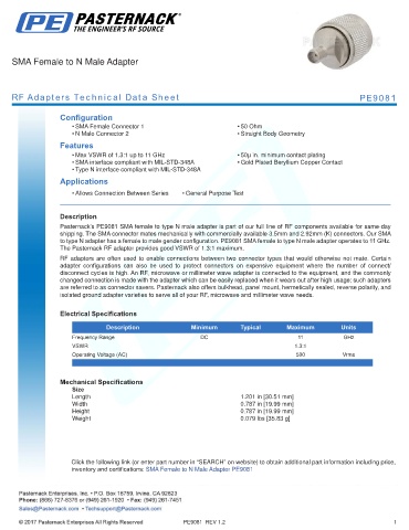 inventory and certifications: SMA Female to N Male Adapter PE9081