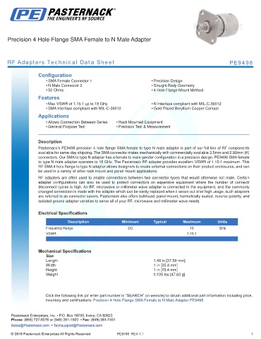 Pasternack’s PE9498 precision 4 hole flange SMA female to type N male adapter is part of our full line of RF components