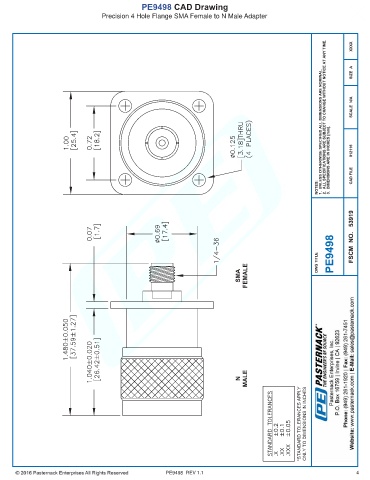 PE9498 CAD Drawing Precision 4 Hole Flange SMA Female to N Male Adapter PE9498 REV 1.1 4