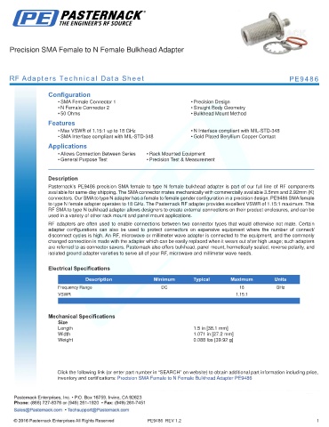 to type N female adapter operates to 18 GHz. The Pasternack RF adapter provides excellent VSWR of 1.15:1 maximum. This