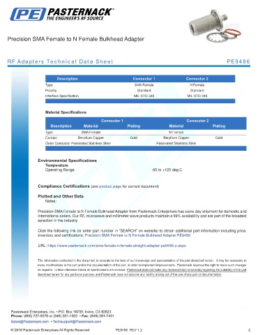 inventory and certifications: Precision SMA Female to N Female Bulkhead Adapter PE9486