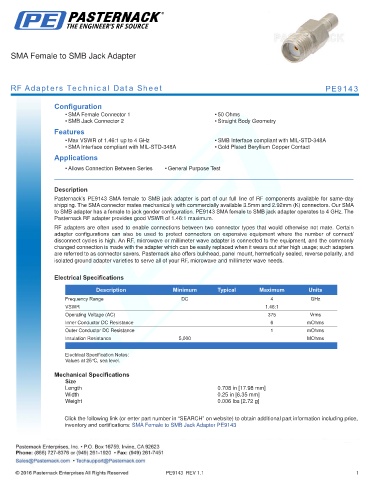 inventory and certifications: SMA Female to SMB Jack Adapter PE9143