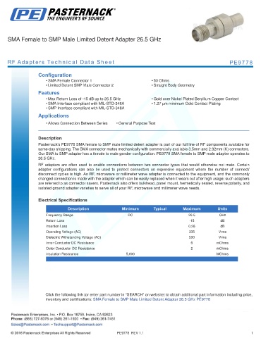 inventory and certifications: SMA Female to SMP Male Limited Detent Adapter 26.5 GHz PE9778