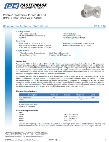 Pasternack’s PE91058 SMA female to SMP male full detent 2 hole flange adapter is part of our full line of RF components