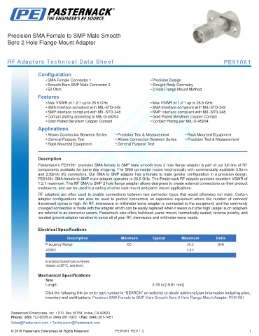 Pasternack’s PE91061 precision SMA female to SMP male smooth bore 2 hole flange adapter is part of our full line of RF