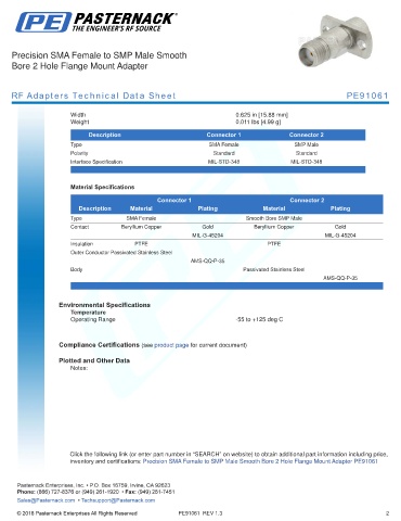inventory and certifications: Precision SMA Female to SMP Male Smooth Bore 2 Hole Flange Mount Adapter PE91061