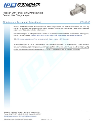inventory and certifications: Precision SMA Female to SMP Male Limited Detent 2 Hole Flange Adapter PE91066