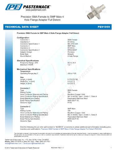 inventory and certifications: Precision SMA Female to SMP Male 4 Hole Flange Adapter Full Detent PE91059