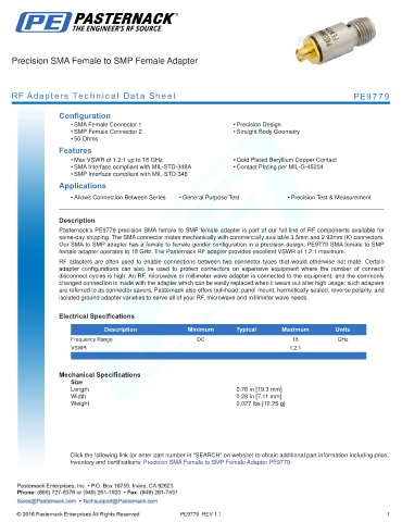 inventory and certifications: Precision SMA Female to SMP Female Adapter PE9779