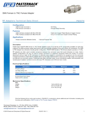 inventory and certifications: SMA Female to TNC Female Adapter PE9079