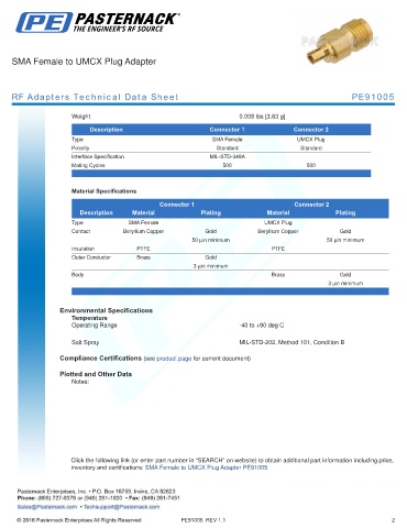 inventory and certifications: SMA Female to UMCX Plug Adapter PE91005