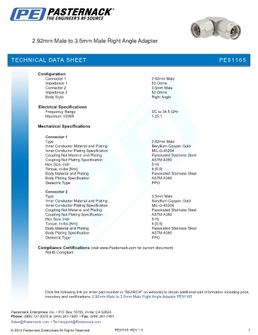 inventory and certifications: 2.92mm Male to 3.5mm Male Right Angle Adapter PE91165