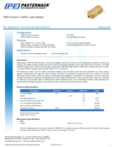 inventory and certifications: SMA Female to UMCX Jack Adapter PE91006