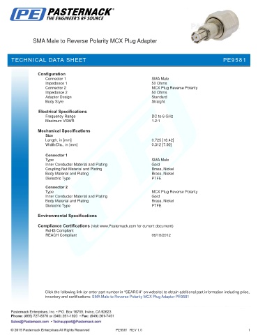 inventory and certifications: SMA Male to Reverse Polarity MCX Plug Adapter PE9581
