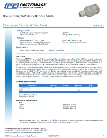 inventory and certifications: Reverse Polarity SMA Male to N Female Adapter PE9732