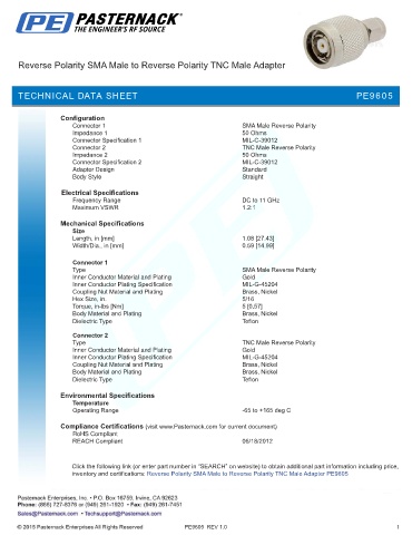 inventory and certifications: Reverse Polarity SMA Male to Reverse Polarity TNC Male Adapter PE9605