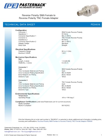 inventory and certifications: Reverse Polarity SMA Female to Reverse Polarity TNC Female Adapter PE9606