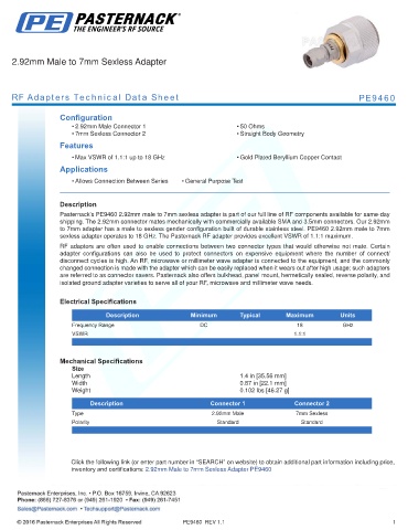 inventory and certifications: 2.92mm Male to 7mm Sexless Adapter PE9460